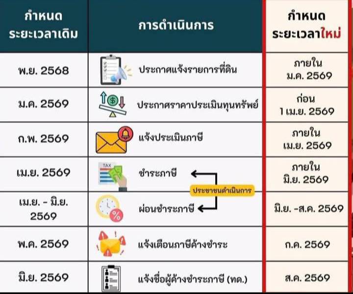 ประชาสัมพันธ์...เรื่องขยายเวลาการดำเนินการตามพระราชบัญญัติภาษีที่ดินและสิ่งปลูกสร้าง พ.ศ.2562 ประจำปี 2569